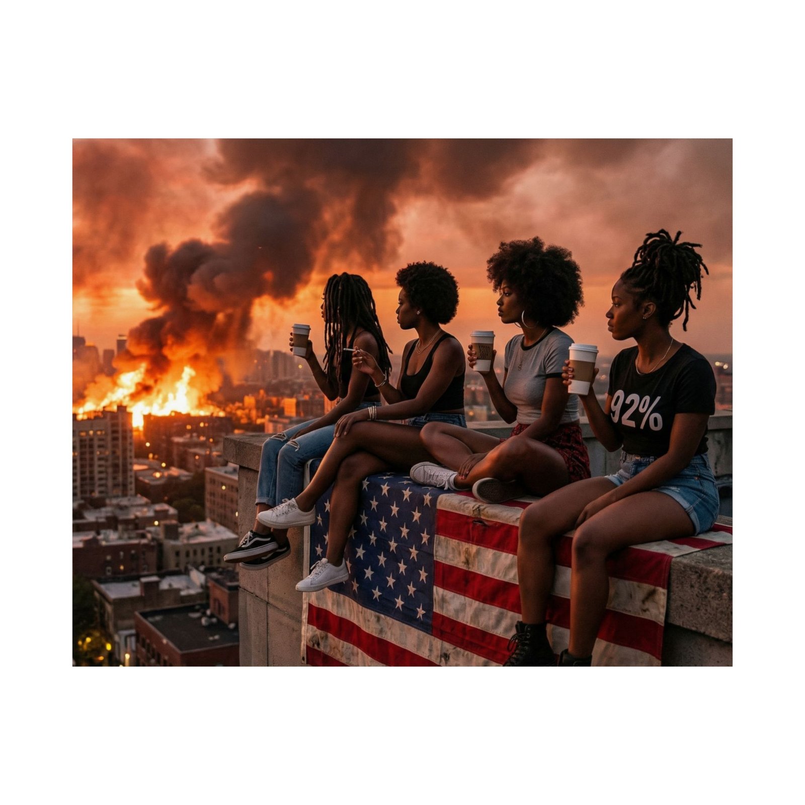 Select options This product has multiple variants. The options may be chosen on the product page Quick ViewMatte Poster — Urban Dystopia: Young Women on Flag-Lined Rooftop with Burning City