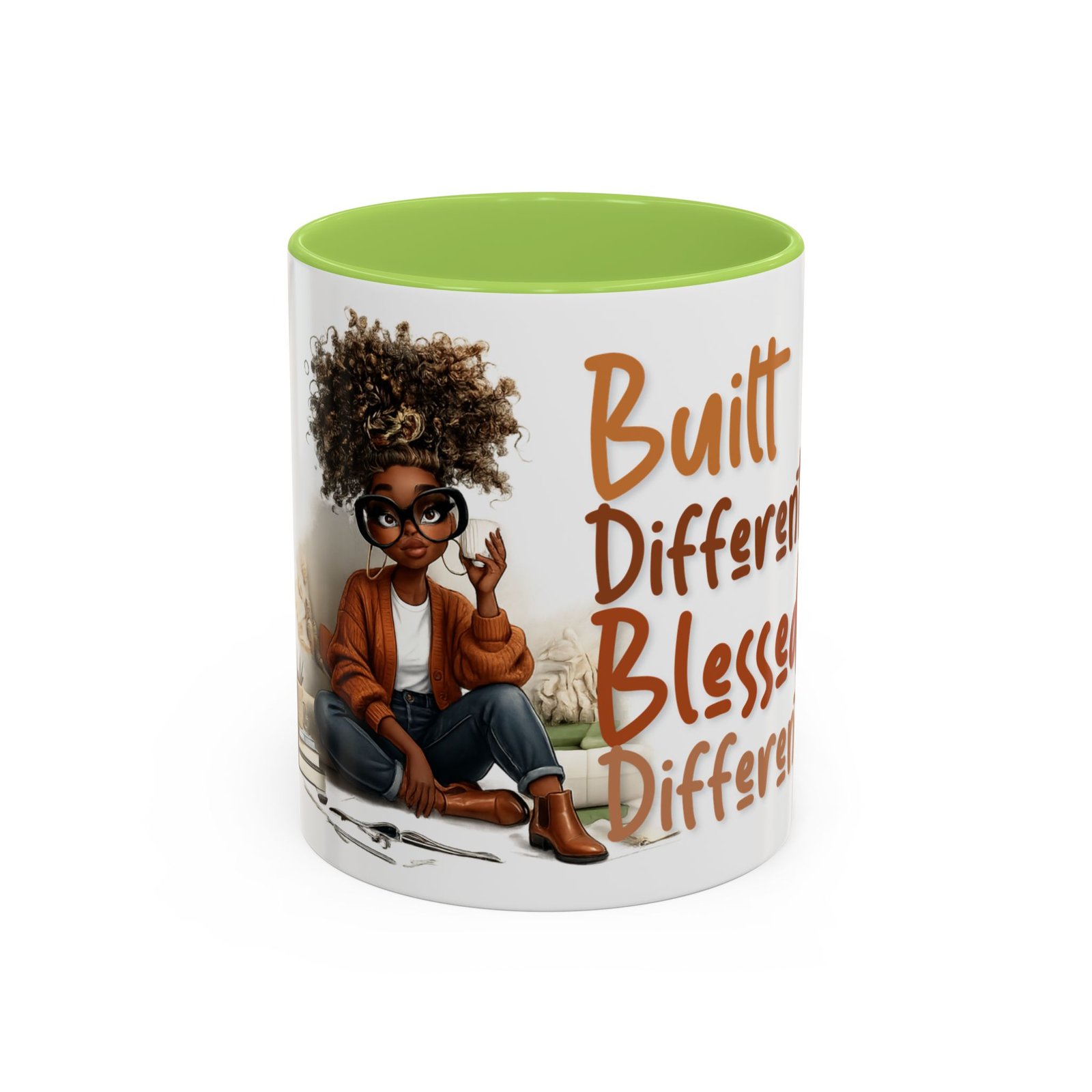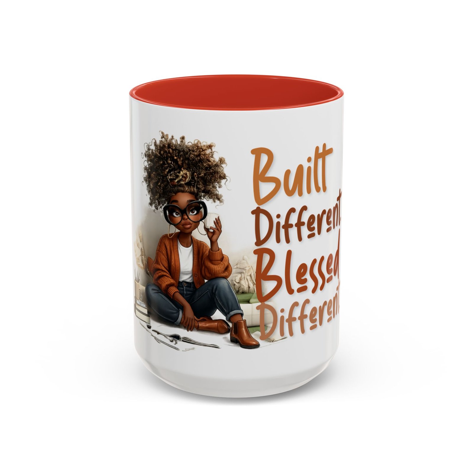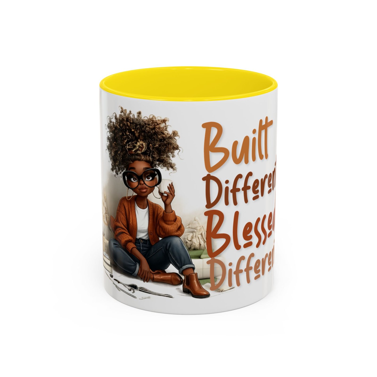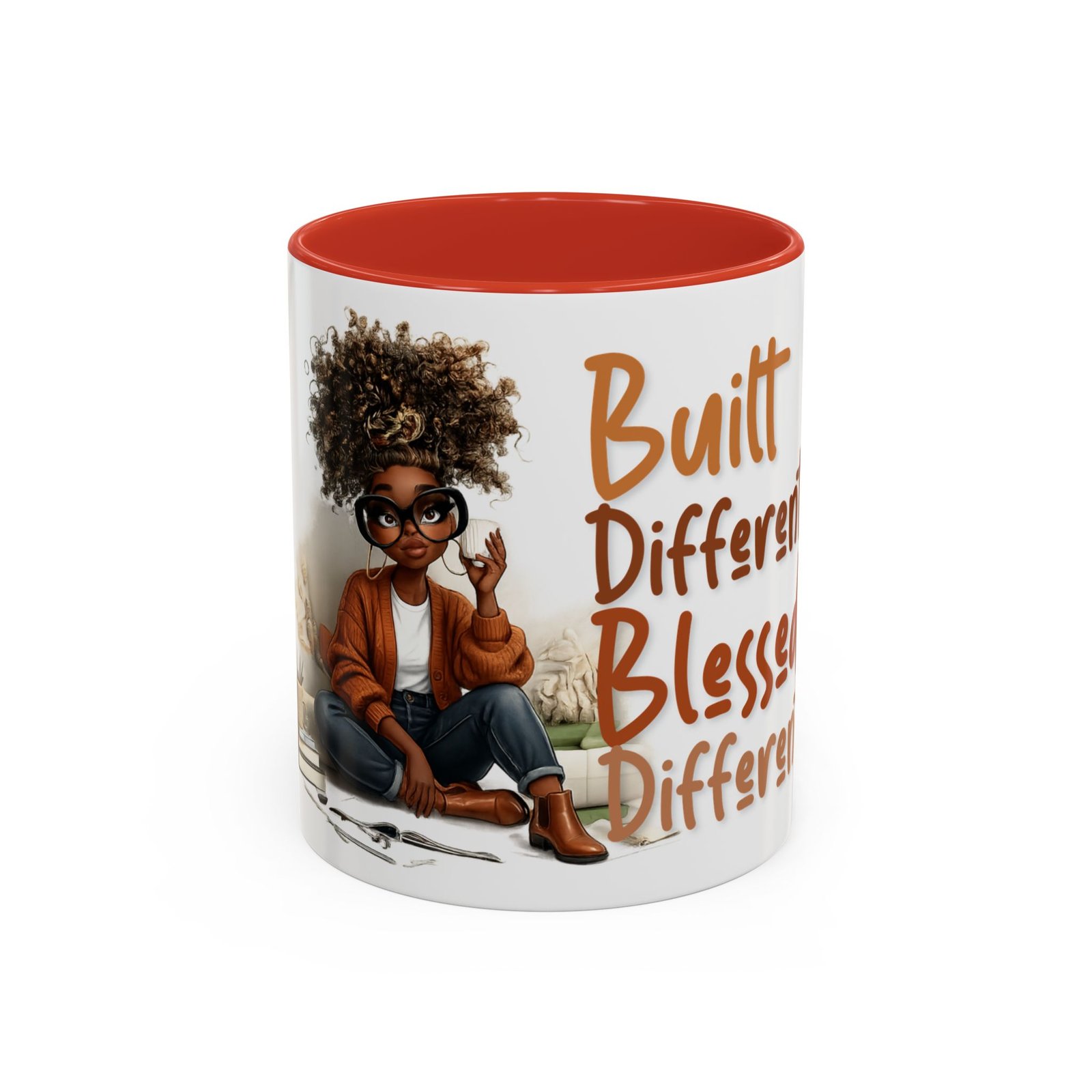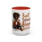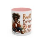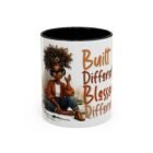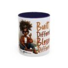 This glossy ceramic mug brings warmth and personality to every sip. With a bold, colorful interior and handle, it frames a playful illustration of a confident young woman and a handwritten-style message that celebrates being “built different” and “blessed different.” The contrast between the deep-colored handle and the bright white exterior makes the artwork pop, while the smooth C-shaped grip keeps the cup comfortable for daily use. Whether used at a cluttered desk or a cozy kitchen table, this mug adds a moment of affirmation and quiet joy to morning coffee, afternoon tea, or late-night study sessions.