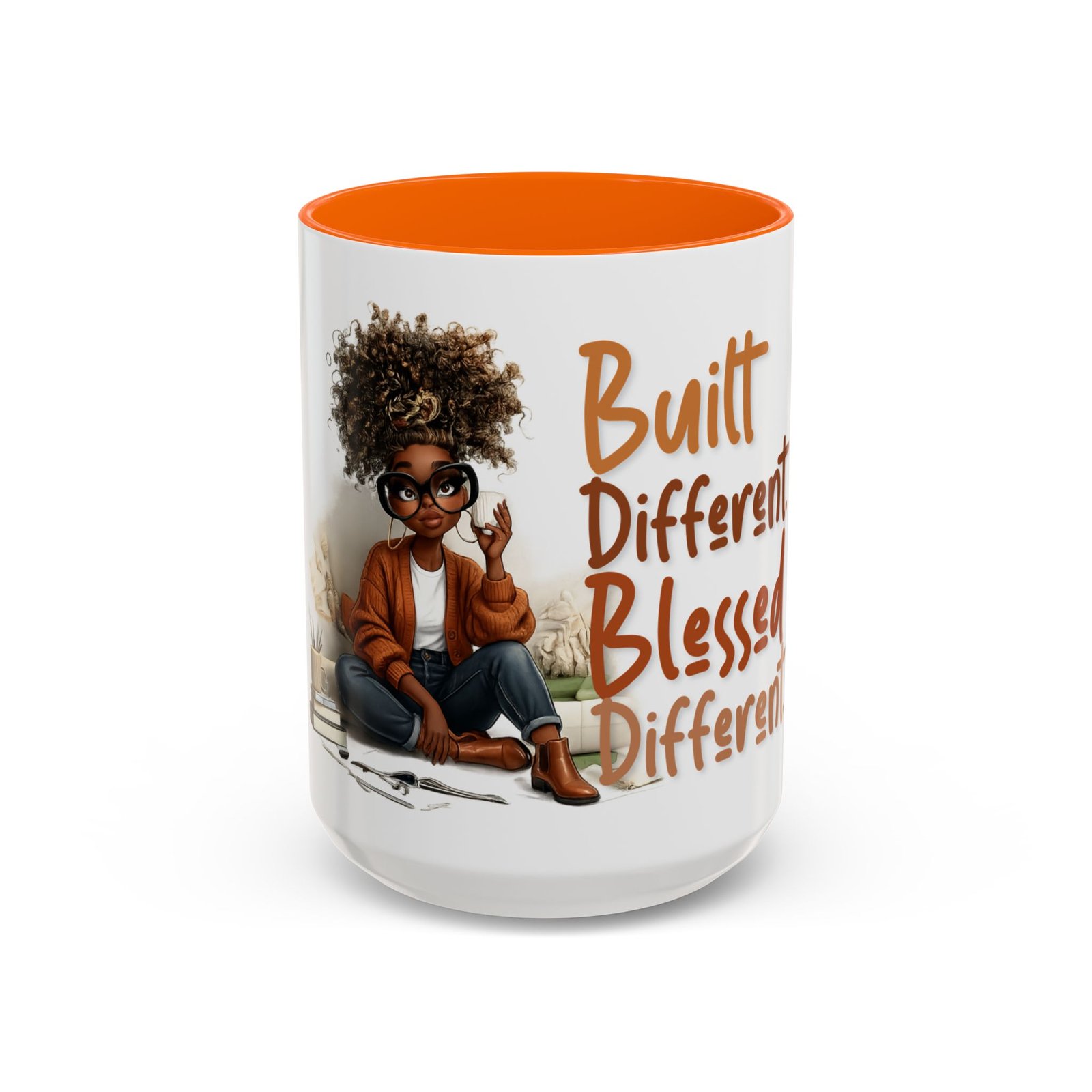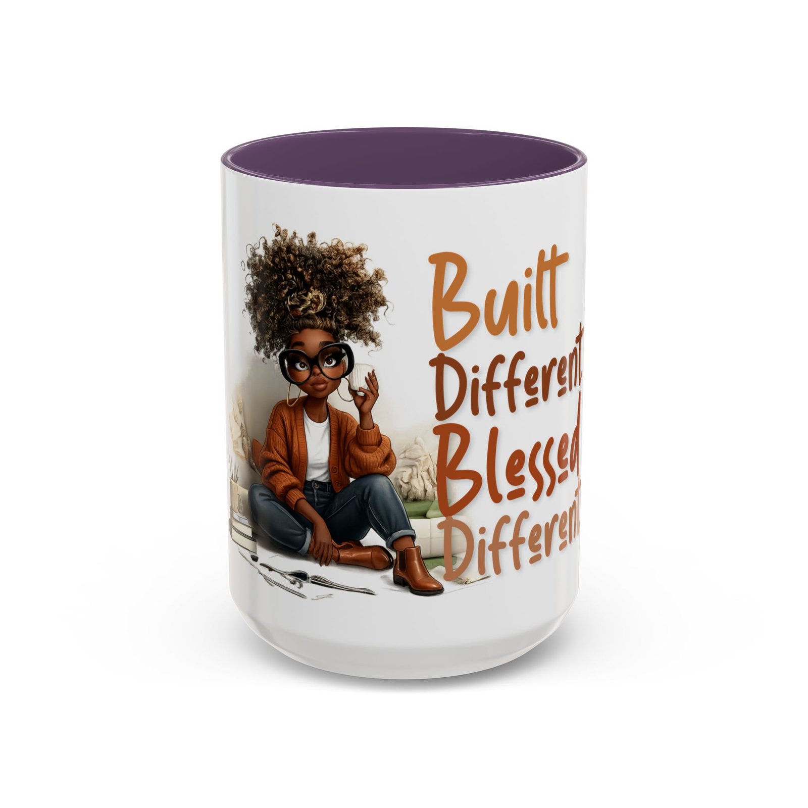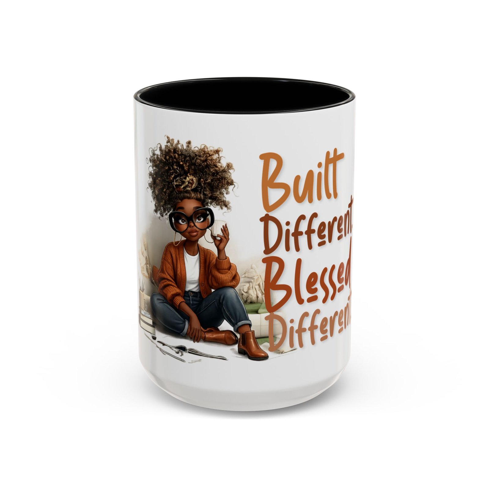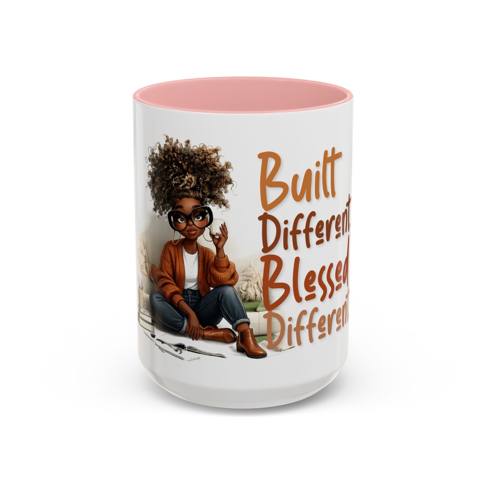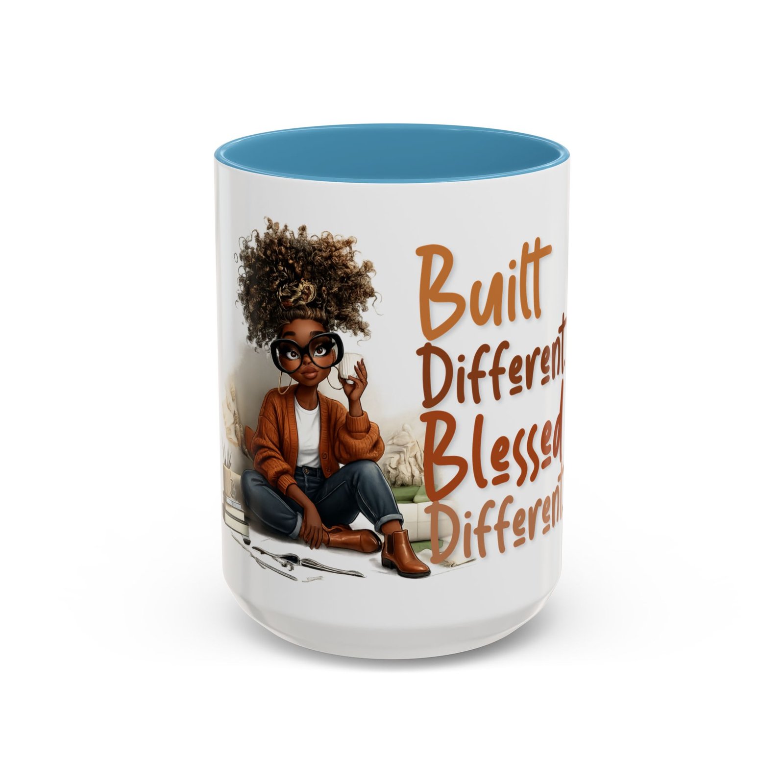 This glossy ceramic mug brings warmth and personality to every sip. With a bold, colorful interior and handle, it frames a playful illustration of a confident young woman and a handwritten-style message that celebrates being “built different” and “blessed different.” The contrast between the deep-colored handle and the bright white exterior makes the artwork pop, while the smooth C-shaped grip keeps the cup comfortable for daily use. Whether used at a cluttered desk or a cozy kitchen table, this mug adds a moment of affirmation and quiet joy to morning coffee, afternoon tea, or late-night study sessions.