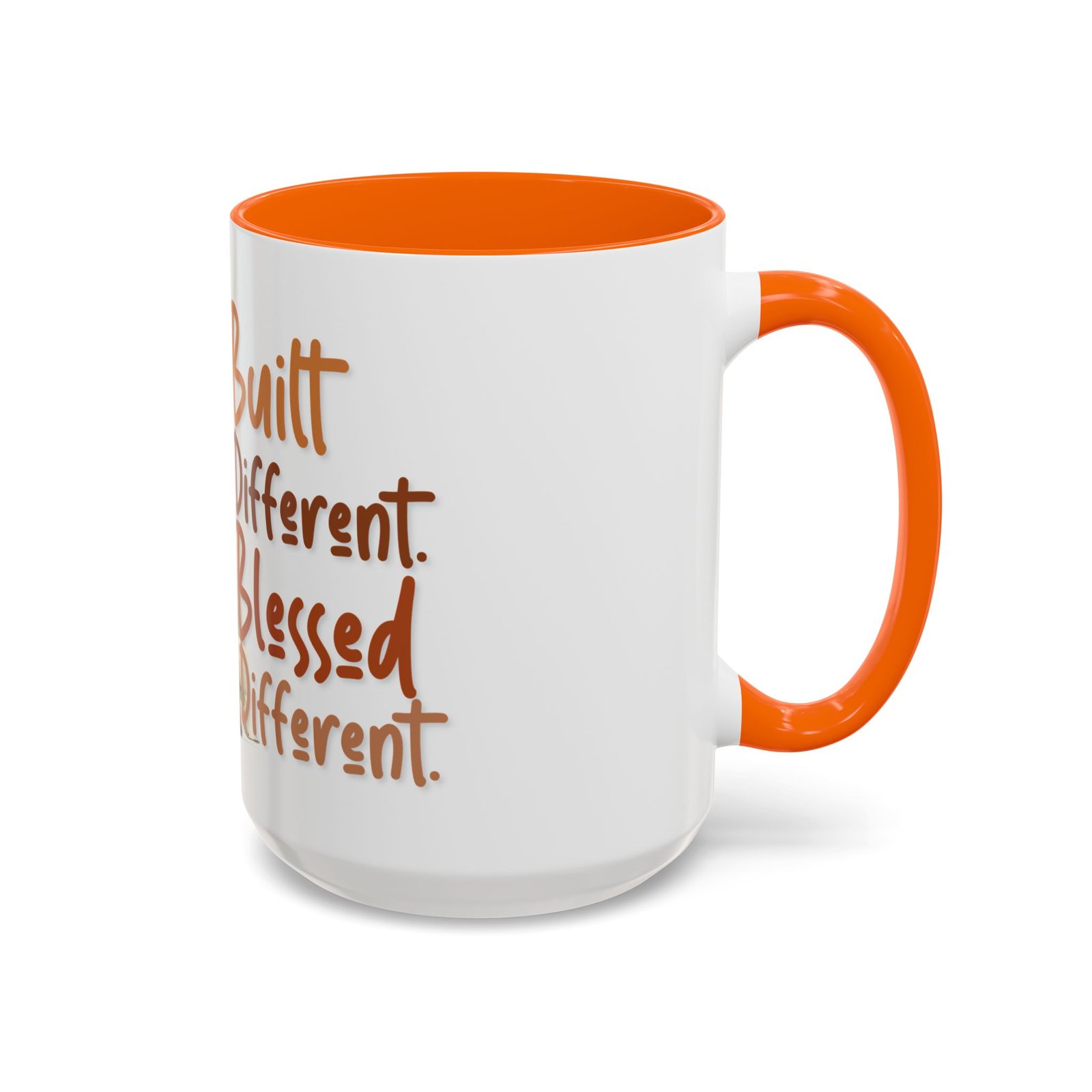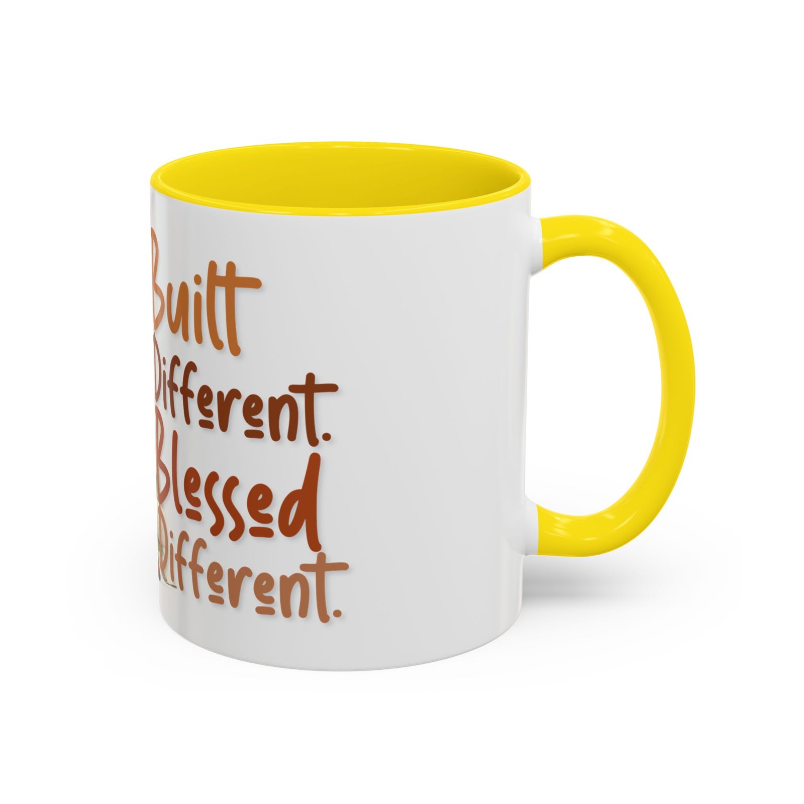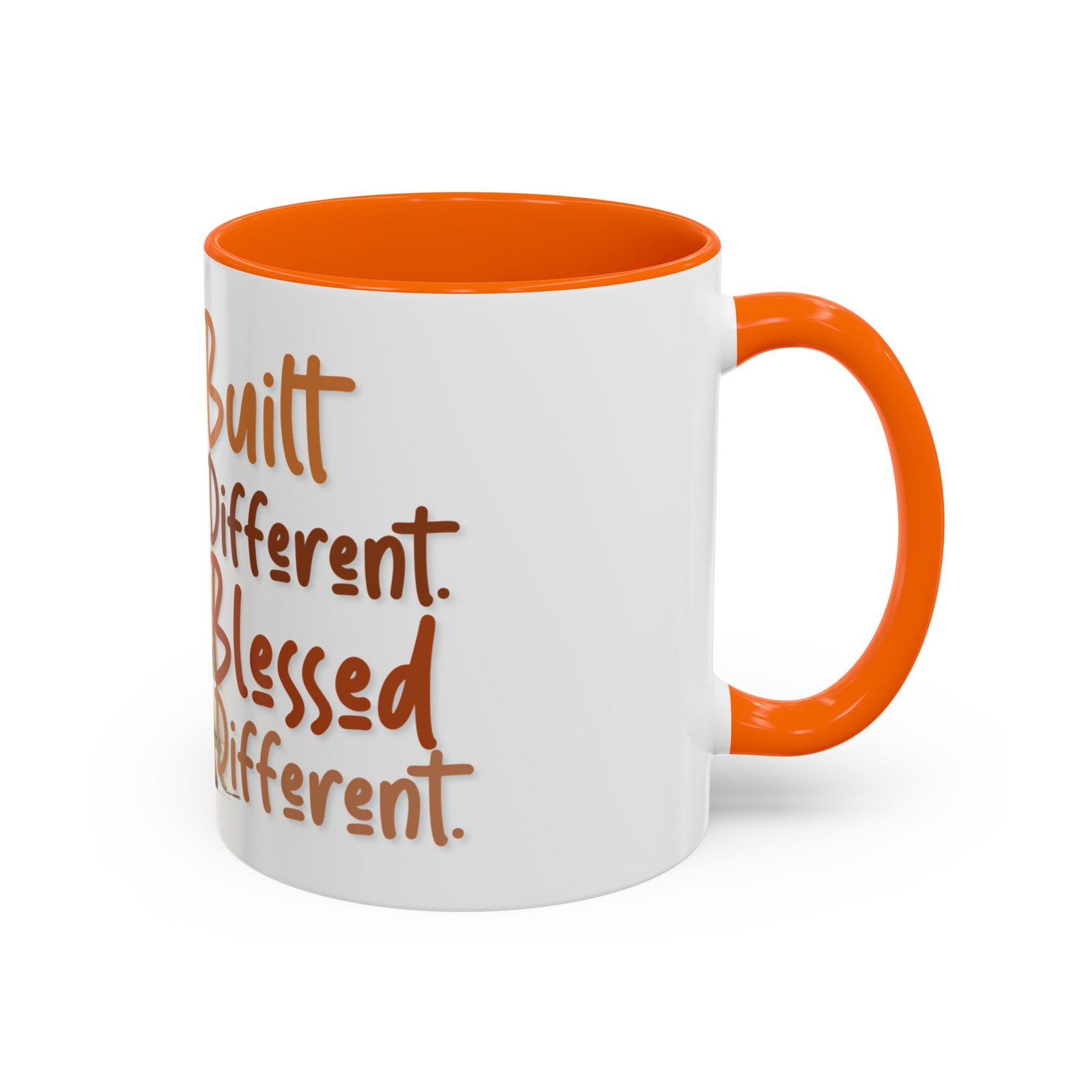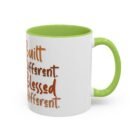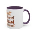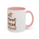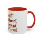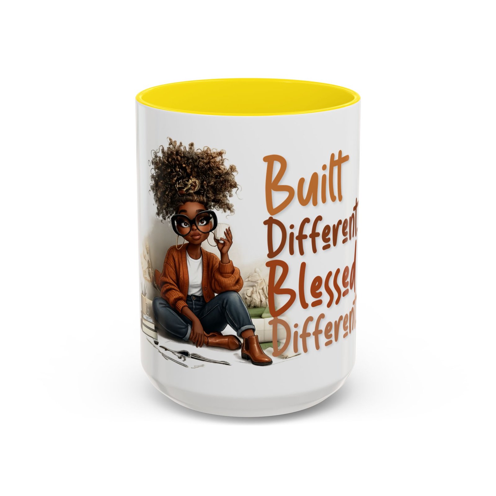 This glossy ceramic mug brings warmth and personality to every sip. With a bold, colorful interior and handle, it frames a playful illustration of a confident young woman and a handwritten-style message that celebrates being “built different” and “blessed different.” The contrast between the deep-colored handle and the bright white exterior makes the artwork pop, while the smooth C-shaped grip keeps the cup comfortable for daily use. Whether used at a cluttered desk or a cozy kitchen table, this mug adds a moment of affirmation and quiet joy to morning coffee, afternoon tea, or late-night study sessions.