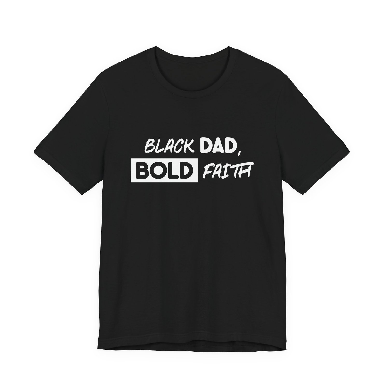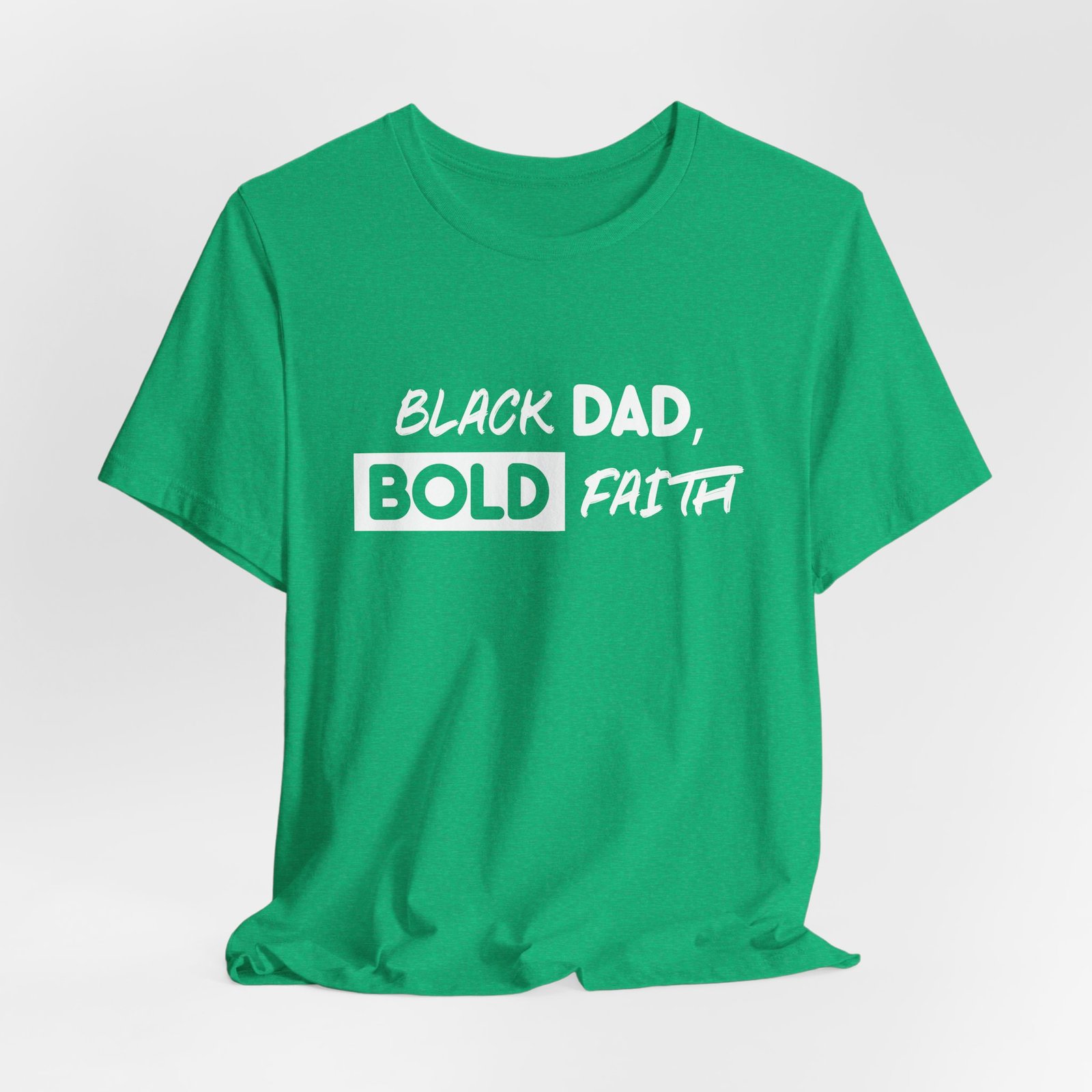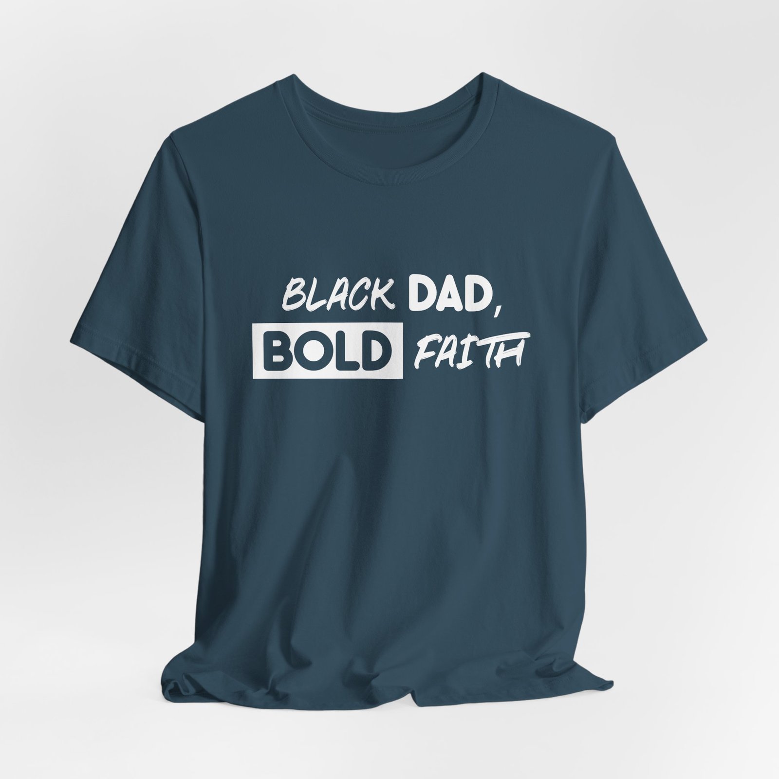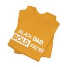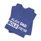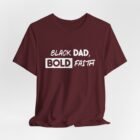 Across the chest, “Black Dad, Bold Faith” is rendered in confident, hand-lettered script—an unapologetic expression of fatherhood, faith, and purpose. It’s a shirt for men leading households, building businesses, mentoring others, and walking boldly in their calling.