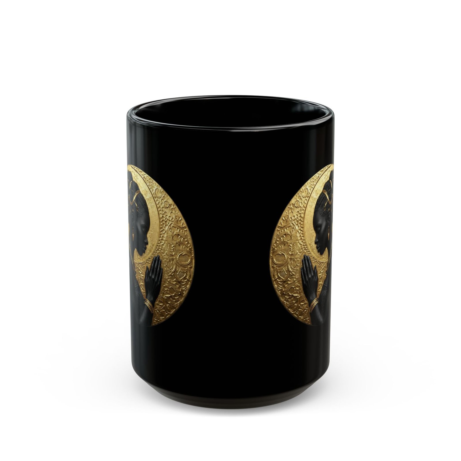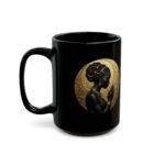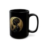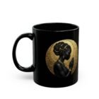 This glossy black ceramic mug carries a quiet, meditative elegance. A silhouette of a woman in profile sits against a textured gold halo, bringing warmth and ritual to your morning coffee or evening tea. The high-contrast print pops on the deep black surface, making the artwork feel like a small altar on your countertop. It’s made to be handled — a comfortable C-shaped grip, sturdy ceramic body, and a gloss finish that deepens the tones. Use it during slow mornings, reflective moments, or as part of a calming ritual at home.