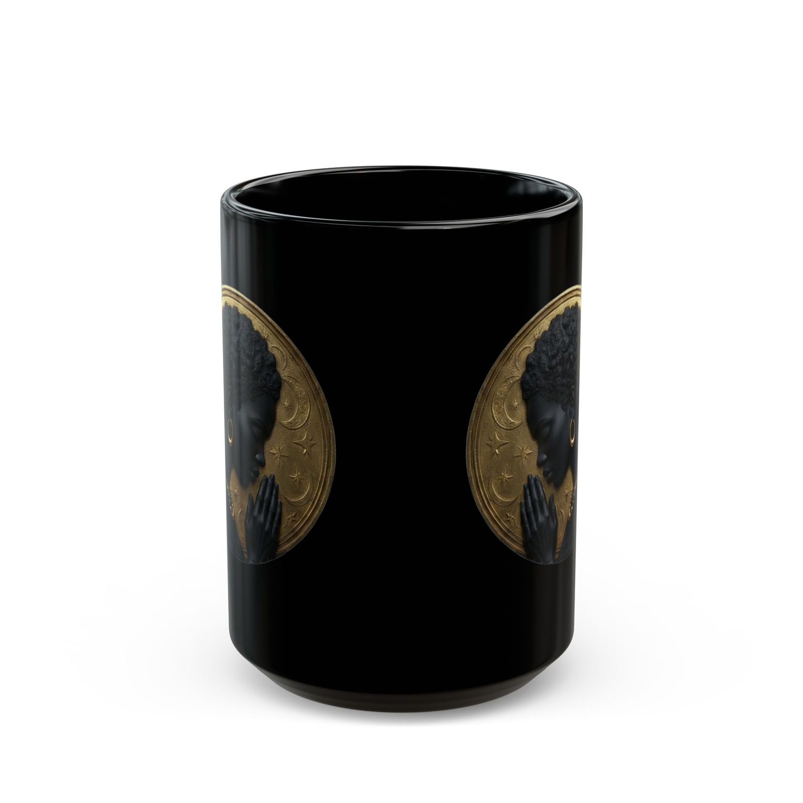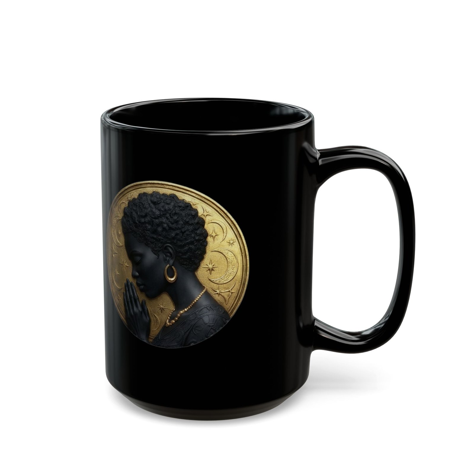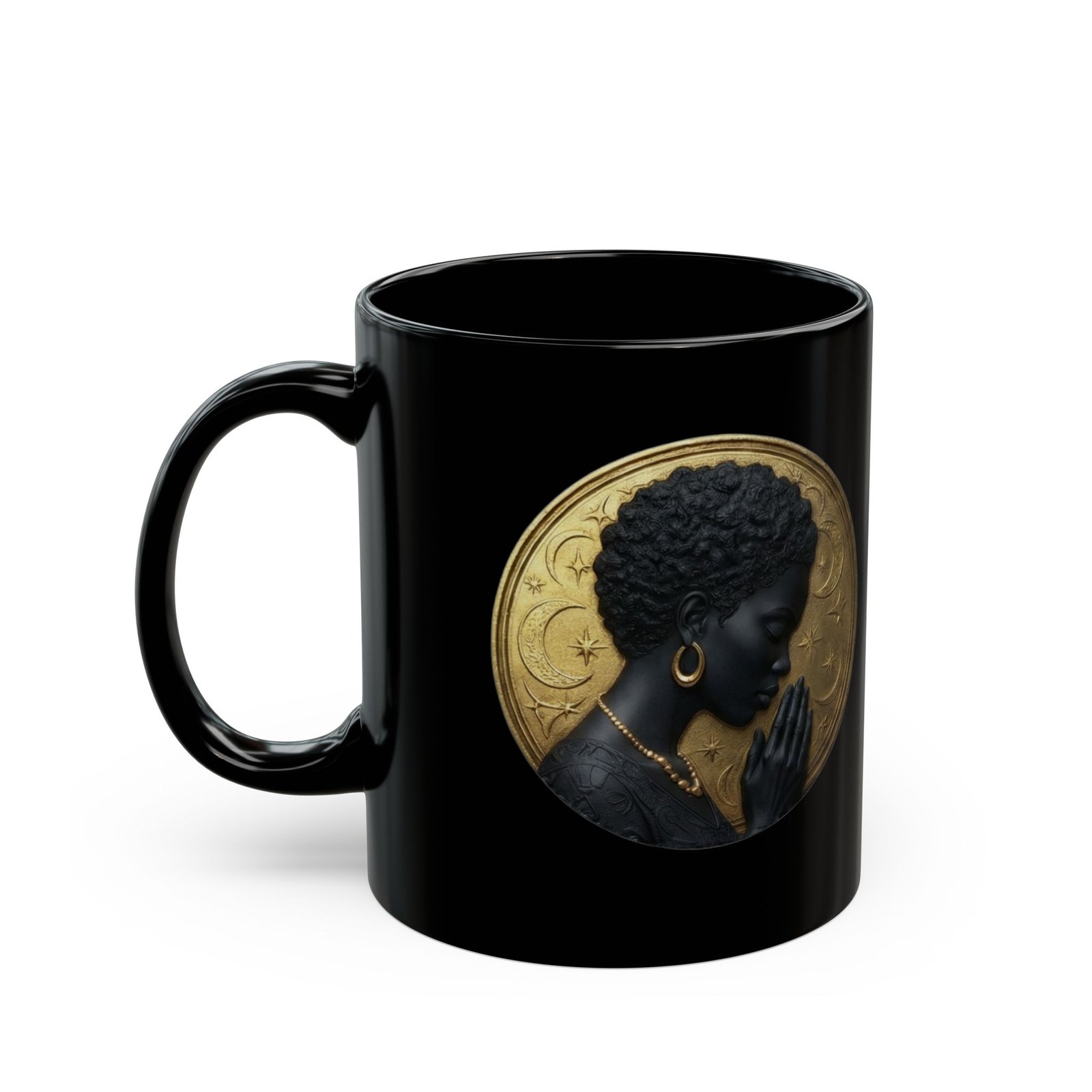 This glossy black ceramic mug carries a quiet, meditative elegance. A silhouette of a woman in profile sits against a textured gold halo, bringing warmth and ritual to your morning coffee or evening tea. The high-contrast print pops on the deep black surface, making the artwork feel like a small altar on your countertop. It’s made to be handled — a comfortable C-shaped grip, sturdy ceramic body, and a gloss finish that deepens the tones. Use it during slow mornings, reflective moments, or as part of a calming ritual at home.